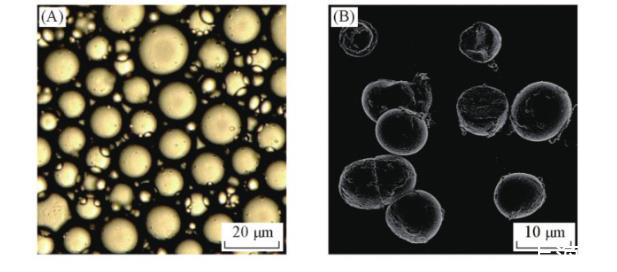 以DA-GQD为颗粒乳化剂、L-薄荷醇(热熔)为油相制备的Pickering乳液的光学显微镜照片(OM)如图5(A)所示。从图5(A)可以看出,Pickering乳滴粒径约为10μm,具有规则统一的球形形貌。由于DA-GQD具有较高的亲水性,因此倾向于形成稳定的水包油型乳液。DA-GQD固体颗粒分散在薄荷醇/水界面,这是因为液-液界面的一部分被液-颗粒界面代替时总界面能降低,L-薄荷醇被微小的石墨烯片覆盖,位于液滴的中心。
