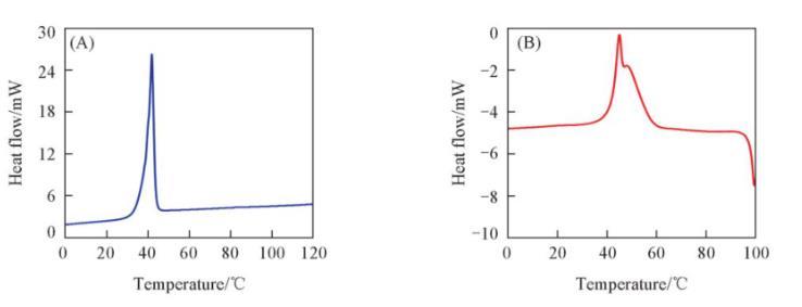 图6(A)和(B)分别为空白样品与负载型样品的示差扫描量热(DSC)曲线。从图6(A)可以看出,L-薄荷醇样品在大约42℃左右出现一个尖锐的吸热峰,对应于L-薄荷醇的熔点。而负载型样品则出现了两个吸热峰[图6(B)],其中第一个峰主要是由生长在DA-GQD外表面的薄荷醇小晶体融化引起的,而第二个峰主要是由DA-GQD包覆的薄荷醇小晶体融化引起的。这与刘绍华等的研究结果相类似。