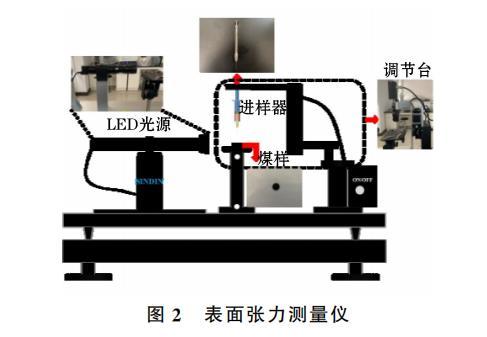 液体从喷嘴喷出初始阶段,表面张力会对射流雾化产生阻碍作用,所以表面张力对喷雾场雾化性能有重要影响。测量表面张力时,调节样品台和光源在同一高度,在进样器中装入1mL待测矿井水后滴至测量台,待测溶液与测量台接触瞬间,开始捕捉液滴形态。测量完毕后,利用数据处理系统处理试验数据与图像。
