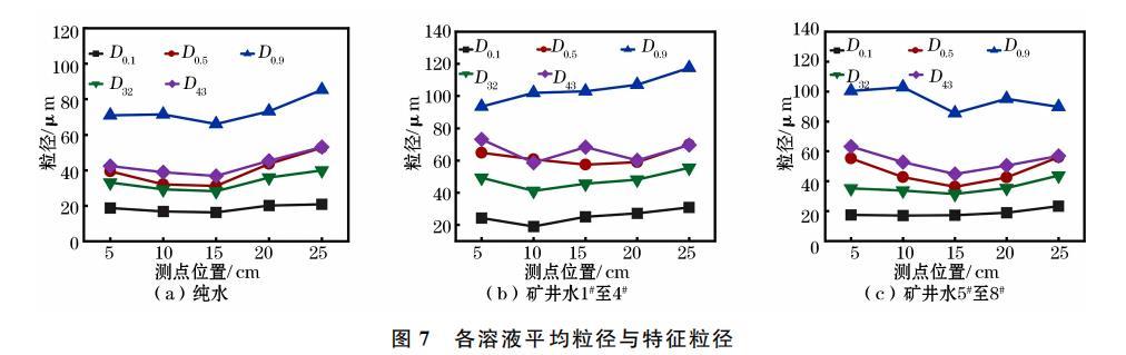 矿井水1#至8#在15cm处的平均粒径和特征粒径逐渐增大,这说明表面张力对喷雾平均粒径和特征粒径具有直接影响。矿井水1至4#各平均粒径和特征粒径之间差异明显,而其余溶液差异较小,这表明纯水和矿井水5#至8#的喷雾粒径分布优于矿井水1至4,雾场中雾滴更趋向均一化分布,易于捕集沉降粉尘。综上,矿井水中Na+、K+离子浓度对其表面张力及喷雾液滴粒径变化趋势至关重要,对于雾场中喷雾粒径的均一性和各平均粒径和特征粒径的差异性也有重要影响。