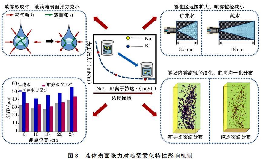 结合试验结果,得到矿井水Na+、K+浓度对喷雾雾化特性的影响机制如图8所示。溶液中Na+、K+等离子浓度通过改变其表面张力,间接影响喷雾雾场性能。当溶液中Na+、K+等离子浓度减小,气-水界面对离子排斥作用减弱,导致溶液表面张力减小。
