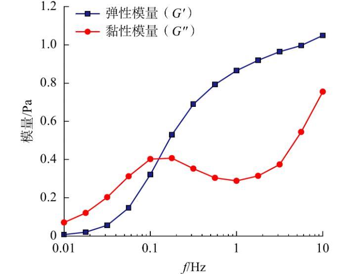 图8为小段塞的黏弹性随振动频率(f)的变化情况。从图8可看出,在低频段,符合Maxwell流体模型。G"远大于G',体系黏性占主导。随着f的增大,G'迅速增长,增长到一定频率时,G'变化曲线增长减缓。此时,G"随着频率的增大先增加后减小。当f继续增大,体系处于高频段,G''有所增加。可见,体系中存在胶束的破坏与重组,此时体系主要表现为弹性性能。在低频区,形变发生较慢,胶束链能量较低;在高频区,胶束链间没有充足时间来发生滑动,胶束链交联缠结点与固定网格节点近似相同,高的频率使得这些网格结构的弹性逐渐增强。