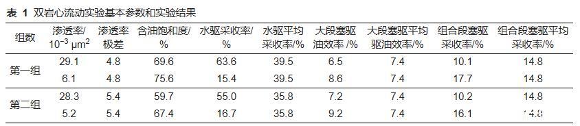 从表1可知,通过并联天然岩心表面活性剂驱油实验发现,只用大段塞驱平均提高采收率7.4个百分点,非常低。而采用组合段塞进行调和驱,第一组组合段塞驱在高低渗层分别提高驱油效率10.1个百分点和17.7个百分点。第二组组合段塞驱在高低渗层分别提高原油采收率10.2个百分点和16.1个百分点,两组组合段塞驱平均提高采收率为14.8个百分点,比只用大段塞驱平均采收率提高了1倍,达到了聚/表二驱的驱油效果。
