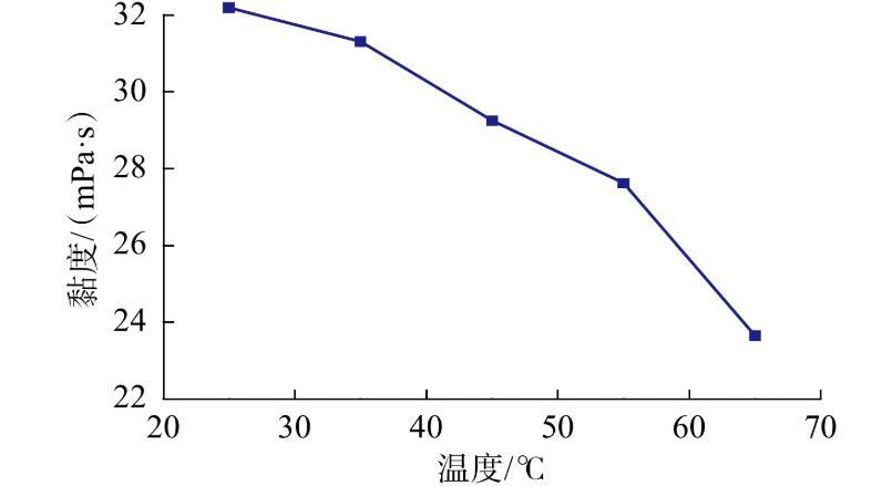图9是质量分数为2.7%的ACS-2高黏表面活性剂体系溶液的黏度随温度的变化情况。从图9可看出,随着温度的增加,体系的黏度随之减小,且减小的速率逐渐增大。但对于目标井区45℃左右的地层温度,仍能起到较好的调剖作用。