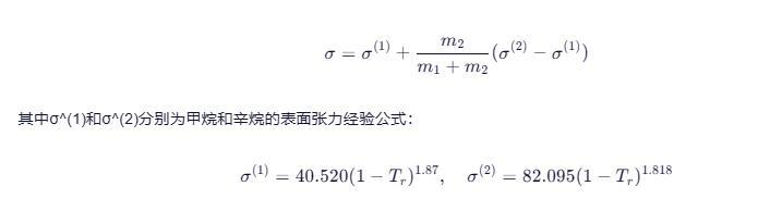 其中σ^(1)和σ^(2)分别为甲烷和辛烷的表面张力经验公式: