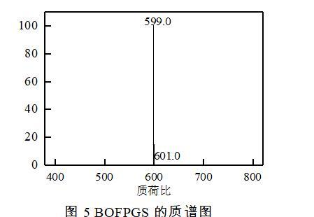 图5为BOFPGS的质谱图表征,数据如下:MS(API):C13H11O3F16SO3-[M-H]-的质荷比理论值为599.00,实测值为599.0。