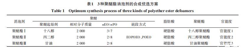 表1 3种聚醚酯消泡剂的合成优选方案
