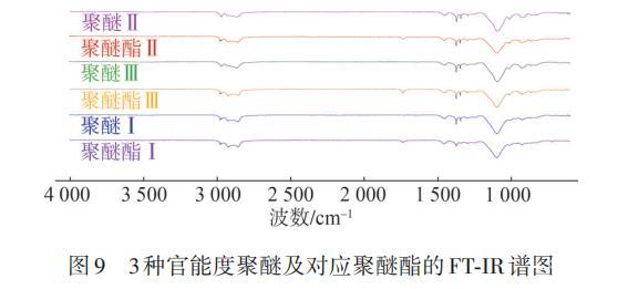 图9为3种官能度的聚醚和聚醚酯FT-IR谱图。由图9可以看出,在3种官能度聚醚的FT-IR谱图中,1 737 cm⁻¹处均无特征峰,而3种官能度聚醚酯在1 737 cm⁻¹处均有特征峰,为酯基C==O的吸收峰,说明3种官能度聚醚末端的醇羟基已经与脂肪酸发生反应。2 971 cm⁻¹处的特征峰表明有—CH₃存在,2 857和1 455 cm⁻¹处的特征峰表明存在—CH₂—,1 296 cm⁻¹处的特征峰则为—CH₃的弯曲振动峰,在1 097 cm⁻¹处的C—O—C伸缩振动峰较明显,表明聚醚酯中醚键较多。