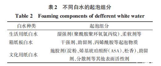 表2为不同种类白水的主要起泡组分,图7为3种聚醚酯消泡剂在生活用纸白水、箱纸板白水和文化用纸白水中的消泡性能。由表2可知,不同种类白水的起泡组分存在明显差异,因此本研究分别讨论不同种类白水中,不同聚醚酯消泡剂的消泡性能。
