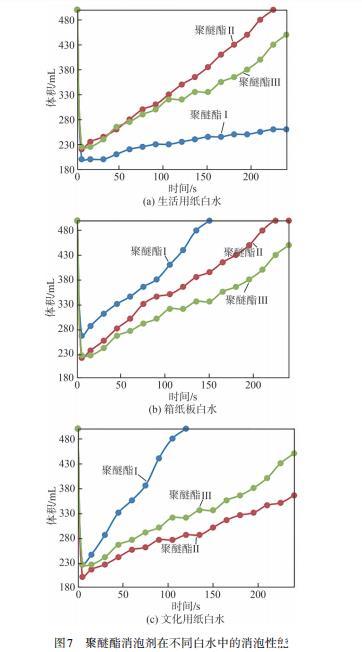图7聚醚酯消泡剂在不同白水中的消泡性能