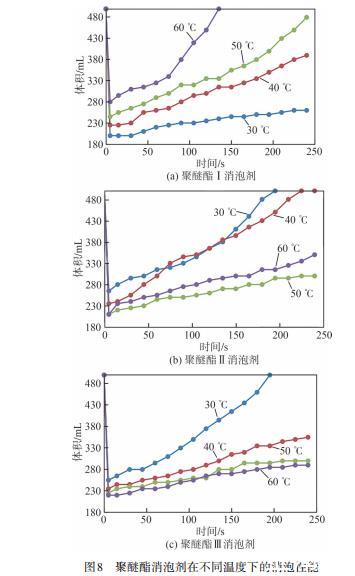 图8为聚醚酯消泡剂在不同温度下的消泡性能。