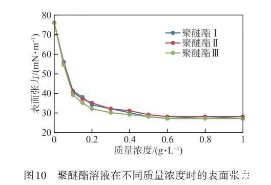 在室温下,将聚醚酯配制成不同质量浓度的水溶液,测试其表面张力,结果见图10。由图10可知,聚醚酯溶液的表面张力随其质量浓度的增高而下降,当聚醚酯溶液的质量浓度为0~0.2 g/L时,聚醚酯溶液的表面张力下降较快,当聚醚酯溶液的质量浓度大于0.2 g/L时,聚醚酯溶液的表面张力随其质量浓度的增加而下降较慢,3种官能度聚醚酯的表面张力下降趋势基本一致,当聚醚酯溶液的质量浓度提高到0.6 g/L时,3种聚醚酯溶液的表面张力均降至27.0 mN/m,说明聚醚酯在较低的质量浓度下可以快速降低表面张力,表面性能优异。