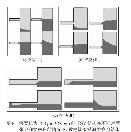 模型(I)使用的表面张力和接触角为不含活性剂的TSV标准镀液的实际测量值,仿真结果是不能完全浸润;模型(II)采用的是在1L TSV标准镀液中加入20mL活性剂溶液的实际测量值,这两种模型在仿真中均表现为不能完全浸润。