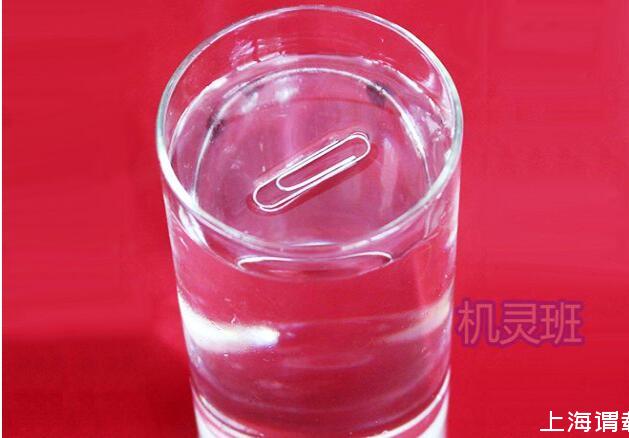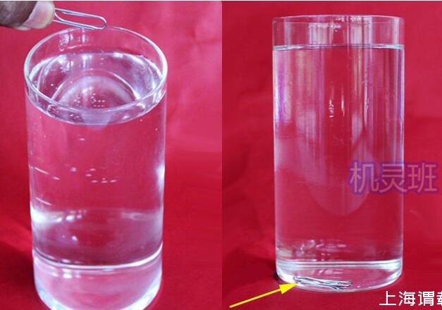 1、将回形针放入一杯水中,回形针会下沉至玻璃杯的底部!