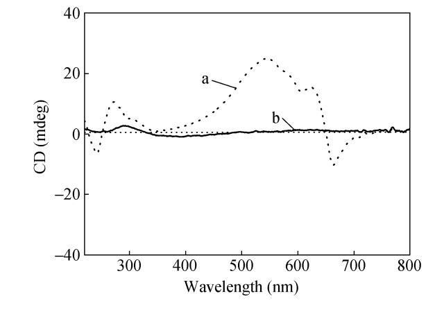 香豆素基团在紫外光照条件下可发生可逆的光二聚反应:在365nm光辐照下,香豆素基团能发生光二聚反应,在254nm辐照下香豆素二聚体能可逆地发生解二聚反应。可以预见香豆素端基的二聚化将影响香豆素取代二乙炔单体在气液界面的组装,从而影响聚二乙炔主链螺旋结构的形成。XVDEVIOS官方下载免费版用365nm紫外灯辐照CODA氯仿溶液20min,此时香豆素端基能发生二聚,而二乙炔基团不会发生聚合。将得到的CODA二聚体的氯仿溶液铺展在水面上,沉积制备LB膜,制备得到的CODA二聚体LB膜能聚合成蓝相。CD光谱测试发现香豆素基团和相应的聚二乙炔吸收带均出现了明显的CD信号,但强度较CODA LB膜均有所减弱,如图8所示。