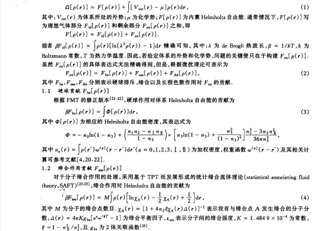 分子缔合作用在各种流体中普遍存在,且对体系的结构和热力学性质有很大影响。对于体相缔合流体中缔合作用的处理通常是采用 Wertheim 所提出的热力学微扰理论(thermodynamic perturbation theory,TPT)及在其基础上所建立的自 由能密度泛函。Stepniak 等采用 DFT 研究了只有一个缔合点的缔合 Lennard-Jones(associating Lennard-Jones,ALJ)流体的相图;Huerta 等在 DFT 的理论框架中研究了受限于平板狭缝中的 4 点 ALJ 流体的相行为,并且分析和讨论了缔合能和缝宽对层状结构转变、临界温度、三相点温度以及相图的影响;Millan 等研究了柱腔中的缔合流体及固体基板附近的 ALJ 流体的非均匀热力学性质;Yu 等将 FMT 拓展到非均匀缔合流体,并研究了狭缝中 4 点缔合流体的平衡密度分布、剩余吸附以及相行为,其结果 与 Monte Carlo 模拟结果吻合。