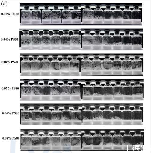 研究结果显示,表面活性剂浓度越高,表面张力降低越明显。比较两种常用表面活性剂,PS20降低表面张力的效果比PS80更强。