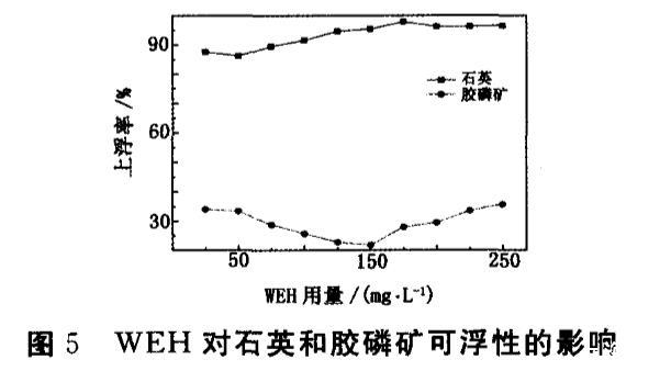 由图5看出,使用WEH后,石英上浮率可以提高到90%以上。当WEH用量低于150 mg/L时,ZB和磷酸对胶磷矿的抑制作用不明显;当用量超过150 mg/L时,胶磷矿上浮率逐步上升,石英和胶磷矿上浮率差异可达77个百分点,实现了石英和胶磷矿的有效分离。