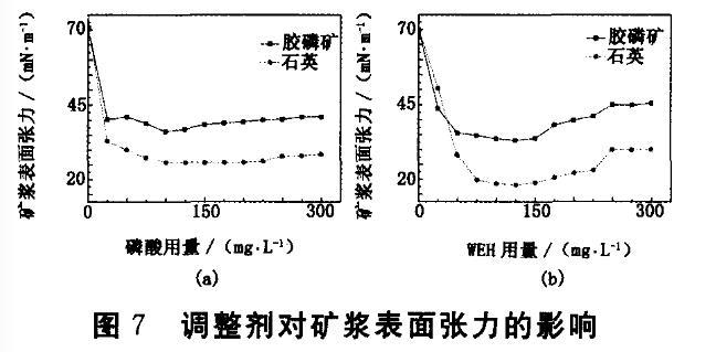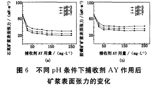 本研究对多种调整剂作用下石英和胶磷矿的可浮性进行了考察,并通过表面张力分析说明矿浆表面张力的影响及捕收剂AY在矿浆中的活性,但还需要在以后的研究工作中进一步探讨捕收剂在石英和胶磷矿表面的吸附机理。