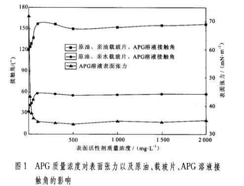 图1 APG质量浓度对表面张力以及原油、载玻片、APG溶液接触角的影响