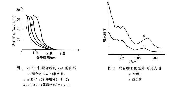 图1a是B的π-A曲线,有明显的“气-液”“液-固”转变阶段,说明B有很好的成膜性。随着表面压力的增加,膜面积不断减小直至崩溃,此时的表面压力为70mN/m,由此得出每个分子占有面积为1.80nm²。在膜崩溃时单分子在亚相上的面积大于酞酞菁分子的平展面积(约1.6nm²),表明B以平展方式排列而形成单分子膜。图1b、c、d分别给出了纯邻菲咯啉、掺杂不同摩尔比邻菲咯啉的π-A曲线,随着邻菲咯啉掺杂摩尔比的增大,膜崩溃时单分子面积减小,而崩溃压不变,表明邻菲咯啉的掺杂对配合物B的成膜性没有影响。