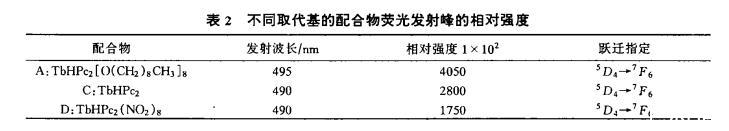 表2列出了配合物A、C、D在氯仿溶液中,指定荧光激发(375nm)和荧光发射峰波长、相对强度及跃迁指定。配合物A、C、D是由不同取代基构成的双酞酞菁铽(III)配合物,当取代基为给电子的壬氧基时(A),可使基态与最低激发态之间的跃迁几率增大,有较强的荧光行为,使荧光强度增加;而取代基为吸电子的硝基时(D),它使荧光强度下降,故有较弱的荧光行为;而酞酞菁是环上无取代基的络合物C,故它的荧光强度居中。