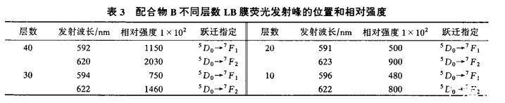 表3配合物B不同层数LB膜荧光发射峰的位置和相对强度