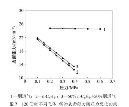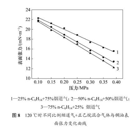2)当压力一定时,温度升高,烟道气-稠油表面张力降低,正己烷-稠油表面张力则升高。在接近饱和蒸气压时,正己烷-稠油表面张力随温度的升高而越小。
