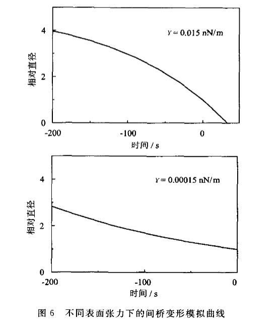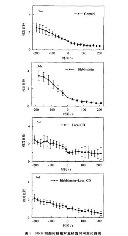 利用公式2通过OriginPro 8.0软件对NRK细胞间桥动力学进行模拟得到的曲线见图6。可以得出,表面张力取正常细胞1/10的理论曲线与整体blebbistatin处理组细胞D₀点之前近似,而取正常细胞1/1000的理论曲线与整体施加blebbistatin并且同时抑制单侧极区皮层肌动蛋白聚合的曲线近似。
