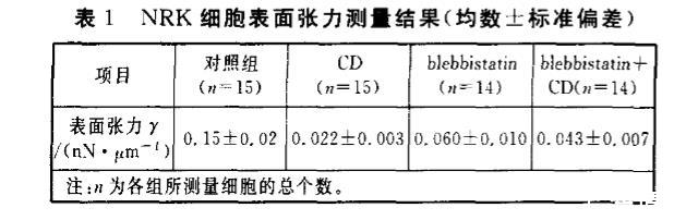 实验中,分别单独加入骨架蛋白抑制剂2μmol/L CD和30μmol/L blebbistatin,再同时加入2μmol/L CD和30μmol/L blebbistatin。各组细胞处理15~20 min后进行细胞表面张力测量。利用公式(1)计算细胞表面张力,实验结果见表1。