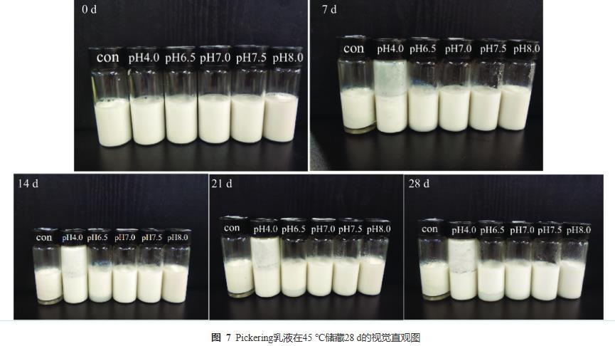 制备了不同pH下PPP-NP稳定的水包油Pickering乳液,并在45℃下加速储存28 d,每7 d进行拍照记录其视觉外观的变化。乳液的视觉外观监测照片如图7所示。con和pH4.0的乳液在加速储藏7 d后发生分层和聚结等现象;pH6.5的乳液在第14 d时底部出现分层现象;pH7.0~8.0的乳液在储藏28 d后仍保持良好的视觉外观,未出现相分离、聚结等现象,在整个实验过程中均保持均匀稳定。这些现象直观地表明PPP-NP具有良好的乳化能力,且制备出的乳液具有较好的稳定性,这可能与蛋白聚集体表面疏水性提高,从而有效降低其在油水界面上吸附所需的能量。