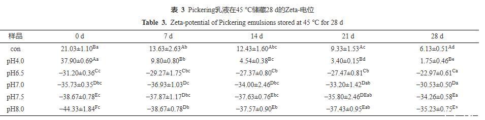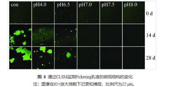 由图8可知,当储藏14 d时,Con、pH4.0的乳液均出现大面积的油滴聚集,pH6.5的乳液出现局部小聚集,而pH7.0~8.0的乳液微观结构显示其分布仍然均匀,无任何油滴聚集现象。当储藏28 d后,Con、pH4.0、pH6.5的乳液中聚集程度明显加强,pH7.0的乳液也有较微弱的局部小聚集现象;而pH7.5与pH8.0的乳液仍保持良好的分布状态,这与图7的视觉直观图、表2粒径监测和表3电位监测的结果保持一致。CLSM的结果再次证实PPP-NP稳定的乳液酸性条件下的长期稳定性较差,在中性和碱性条件下有着更好的乳液稳定性。这一结果与He等的结果相似,其所制备的样品同样在碱性条件下稳定性更高。