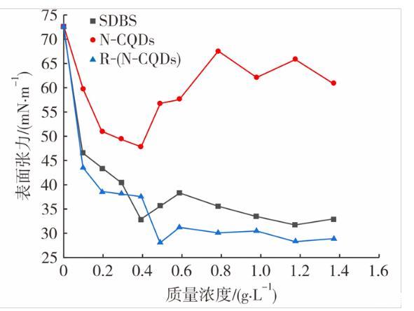 图6 SDBS、N-CQDs及R-(N-CQDs)表面张力与质量浓度的关系