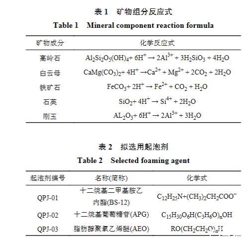 图1为2口低产井采集样品的X射线衍射结果。可以看出,2种无机矿物样品中硅酸盐岩成分占比大,因此选用乙酸、盐酸、氢氟酸3种常规酸液进行无机矿物溶蚀试验,理想状态下矿物组分被单一酸液的侵蚀过程见表1。选用的3种常见起泡剂分别为:十二烷基二甲基胺乙内酯(BS-12)、十二烷基葡萄糖苷(APG)、脂肪醇聚氧乙烯醚(AEO),见表2。其中BS-12为两性离子型起泡剂、APG为阴−非离子型起泡剂、AEO为非离子型起泡剂。