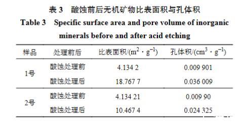 采用ASAP2460全自动比表面积与孔隙度分析仪测定采集无机矿物比表面积与孔隙体积。表3为多组分酸液酸蚀处理2种无机矿物前后测算结果。1号无机矿物酸蚀处理后比表面积增长4.539倍,孔体积增长约3.636 9倍;2号无机矿物酸蚀处理后比表面积增长2.418 8倍,孔体积增长2.457倍。因此酸蚀作用对无机矿物的溶蚀与解堵疏通作用显著。