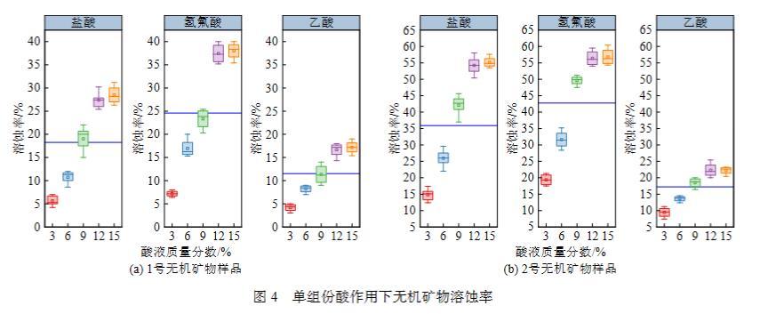 图3为单组份酸作用下无机矿物溶蚀试验记录,图4为无机矿物溶蚀率。由图4可知,氢氟酸对2种无机矿物样品溶蚀效果最佳,质量分数为15%的氢氟酸对1号无机矿物样品的溶蚀率最高达40.2%,平均为37.3%;质量分数为15%的氢氟酸对2号无机矿物样品的溶蚀率最高达59.5%,平均为56.6%。这是由于氢氟酸专适用于硅质物等砂岩地层的酸化,氢氟酸对无机矿物的溶蚀速度很快,但是这会导致酸液作用时间短、酸化距离近的缺点。盐酸溶蚀无机矿物能力较氢氟酸弱、较乙酸溶蚀能力强,质量分数为15%的盐酸对1号无机矿物样品的溶蚀率最高达31.8%,平均为27.7%;质量分数为15%的盐酸对2号无机矿物样品的溶蚀率最高达57.5%,平均为54.6%,可见盐酸对无机矿物有较高的溶蚀率,且具有成本低、生成物可溶、氢离子浓度高的优点。虽然乙酸较盐酸与氢氟酸对无机矿物溶蚀率低的多,但是乙酸是有机酸,为弱酸,具有缓慢释放氢离子的效果,具有缓速性起酸蚀缓速效果,可延长酸液有效距离。