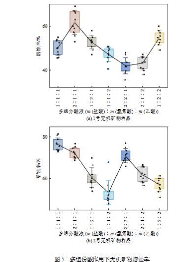 通过单组份酸溶蚀试验,2种无机矿物样品均呈现出酸液浓度越高溶蚀效果越好的趋势,随着酸液浓度逐渐增长,溶蚀率增长速率减缓。当酸液质量分数超过12%时,无机矿物溶蚀效果变化不显著。因此考虑酸液用量、价格、对煤基质危险污染性等因素,选用质量分数为12%时的酸液溶蚀2种无机矿物样品均为高性价比的选择。