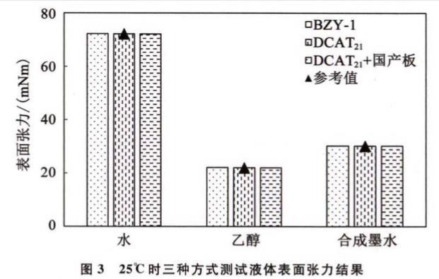 使用BZY-1XVDEVIOS破解版安卓手机安装包(原配国产铂金板)、XVDEVIOS破解版安卓手机安装包(原配进口铂金板)和XVDEVIOS破解版安卓手机安装包(选配国产铂金板)对水、无水乙醇、合成墨水进行表面张力测试,测试结果如图3所示。