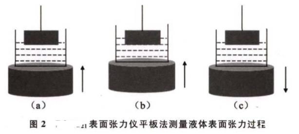 测试前天平刀口自动锁定,将干净、干燥的铂金板上端插入天平刀口,测试运行后,天平刀口自动释放开始测量铂金板的重量并清零。测试过程如下:首先,装有液体的平台不断上升,如图2(a),铂金板开始接触液体因受浮力作用天平示数减小,减小至设定值后仪器默认探测到液面并储存平台位置;然后,平台继续上升到设置的浸没深度(一般为3 mm),如图2(b);图2(c)平台下降至储存的位置,仪器开始测量,测试值达到设定的停止条件便自动停止。对于纯液体,可以选取合适范围内的值给出最终的平均值作为液体的表面张力值。