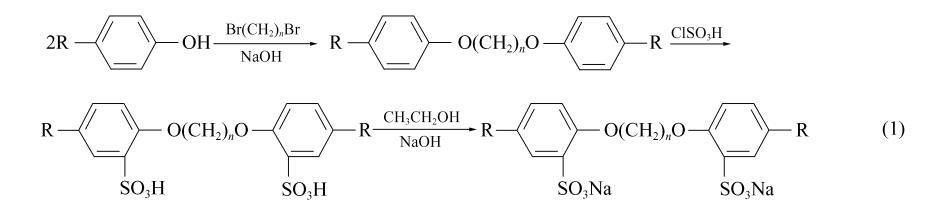 式(1)中,疏水基 R基团为 (CH3)3CCH2C(CH3)2 ;联结基为 -O(CH2)nO-n 为2,4,6,8。所得产物记为 D2Cn 系列。
