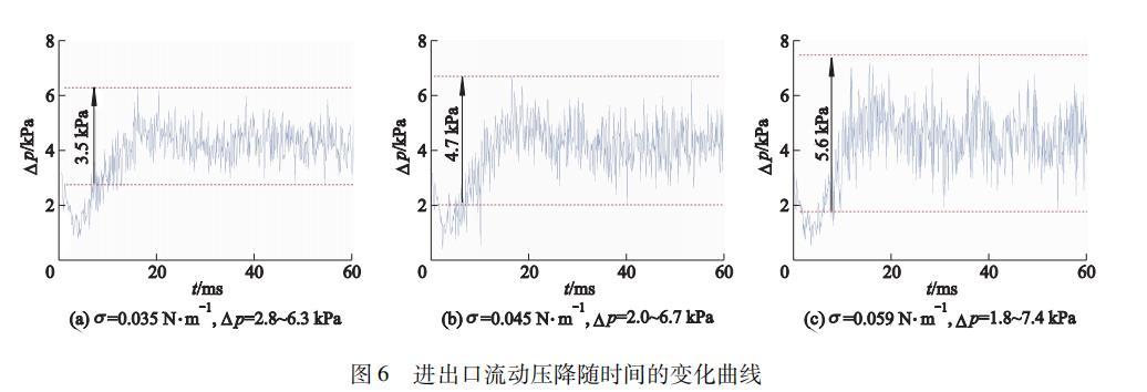 通道进出口汽液两相的总体压降Δp常作为衡量流动是否稳定的标准。σ分别为0.035,0.045,0.059 N·m⁻¹时,通道进出口压降Δp随时间的变化曲线如图6所示。20 ms之后,微通道内的汽液两相流进入相对稳定的充分发展状态,在20~60 ms的时间间隔内,3种表面张力对应的Δp的波动范围分别为2.8~6.3,2.0~6.7,1.8~7.4 kPa。σ=0.035 N·m⁻¹时,Δp波动幅度最小,与σ=0.059 N·m⁻¹相比,Δp波幅减小约2.1 kPa。可以认为,减小表面张力σ,汽液两相的压降波动幅度减小,汽液两相流的流动稳定性提高。