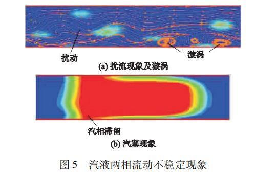 图4中汽液两相速度分布不均的原因:汽泡与通道尺寸在同一量级,汽泡对流动扰动增强,且随着汽泡的急剧生长,当汽泡大小达到微通道尺寸,汽泡堵塞通道,阻碍汽液两相的正常流动,即发生汽塞现象。汽液两相流动不稳定现象如图5所示。