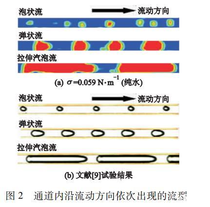 通道内沿流动方向依次出现的流型如图2所示,图2a为σ=0.059 N·m⁻¹(纯水)条件下,数值计算得到的微通道内汽液两相呈现的流型。不难看出:沿流动方向依次出现泡状流(汽泡呈球形)、弹状流(汽泡呈前端椭球,中间圆柱体,尾端近扁平状)和拉伸汽泡流(汽泡在微通道内受限,呈拉伸的柱形)3种流型。这与通过沸腾试验得到的490μm矩形通道内观测段的流型及汽泡形态(图2b)一致。此外,数值模拟结果还与其他文献中的试验结果进行比对,结果表明:计算模型与数值方法可行,计算结果与试验数据吻合较好。