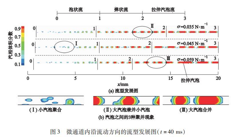 首先从汽泡在微通道的演变与流型发展的特征入手,讨论不同表面张力下,矩形微通道内沿流动方向的汽液两相分布变化的差异。图3a给出了σ分别为0.035,0.045,0.059 N·m⁻¹时各自的汽泡演变与流型发展的计算云图(t=40 ms),图3b为汽泡脱离壁面后的3种不同的聚并现象,I,II,III分别对应于刚脱离加热壁面的小汽泡之间的聚并、较大尺寸汽泡与壁面上尚未脱离或刚脱离的小汽泡之间的聚并、尺寸相当的汽弹或拉伸汽泡之间的聚并。
