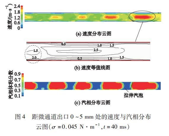 图4距微通道出口0~5mm处的速度与汽相分布云图(σ=0.045 N·m⁻¹,t=40 ms)