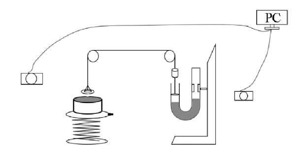 图4为该实验装置设计图。该定量实验材料有U型管、砝码(与金属吊环一样重)、活塞(与U型管内径相吻合且质量极小)、定滑轮、升降台和水槽、两个数码相机。其中一个相机用于录像U型管示数变化,另一个相机用于观察吊环形成水膜的状态。最终两个相机的图像传输至PC端便可准确读出水膜在对应状态下U型管液面高度的示数。