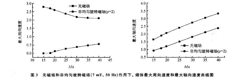图3 无磁场和非均匀旋转磁场(7 mT、50 Hz)作用下,熔体最大周向速度和最大轴向速度曲线图