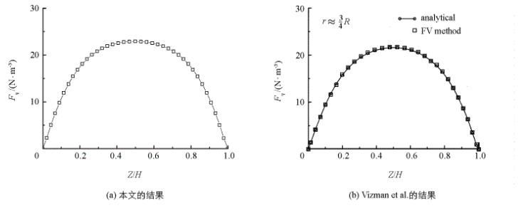 本文对液桥的三维网格进行了有效性验证,最终采用60×68×60的非均匀计算网格。为了验证计算程序的可靠性,本文对Vizman et al。文中的Rayleigh-Bénard结构的算例进行了重复。(采用导电的镓熔体材料的相关参数为:密度ρ=6。1×10^3 kg/m^3,热膨胀系数β=1。26×10^-4 /K,动力学粘度ν=1。907×10^-7 kg/ms,扩散系数κ_T=9。22×10^-6 kg/ms,电导率σ=3。87×10^6 A/Vm)。图2为二极对非均匀旋转磁场下,本文计算得到的熔体在r=3R/4处周向方向的洛伦兹力的分布曲线(a)和文献结果(b)。由图可知,熔体在r=3R/4处熔体周向的洛伦兹力呈抛物线型分布,并在z=0。5H处达到最大值。本文的计算结果与Vizman et al。的结果较好地吻合,且计算所得的周向洛伦兹力的最大值与Vizman et al。通过数值计算和实验得到的最大值的相对误差为1。8%。该结果验证了本文计算程序的可靠性。