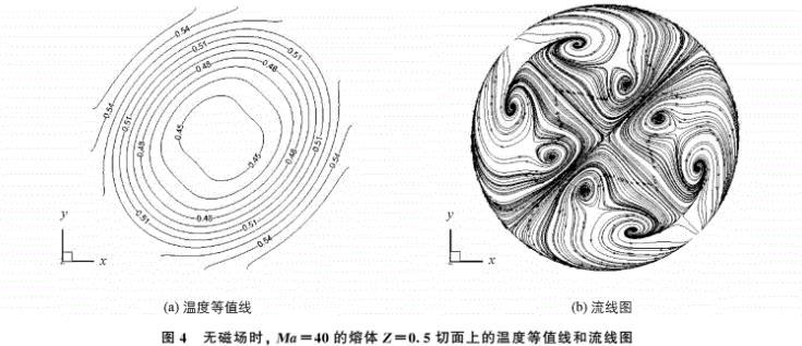 微重力环境下,无磁场时熔体表面张力对流随着Ma数的增大将会产生失稳,首先由二维轴对称定常流转变为三维定常流。Ma=40时,熔体对流已经经历过第一次失稳。此时液桥熔体对流为定常三维流动。图4描述了无磁场条件下,液桥熔体Z=0。5H切面上的温度等值线和流线图。从图4(a)中可以看出,熔体Z=0。5H切面上温度分布具有明显的非轴对称性,且在自由表面附近分别形成了一对热区和一对冷区。同时,从4(b)中看到,Z=0。5H切面上的流线亦为明显的涡流结构:在自由表面附近,熔体从低温区流向高温区,这一流动与自由表面上轴向表面张力驱动流体从高温区流向低温区是相反的,结果表明半浮区液桥的周向流动并不是表面张力驱动的。表面张力只是作为周向流动的微弱的反作用力而存在。