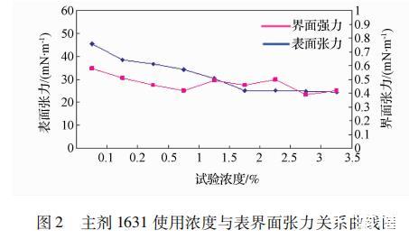 试验中按不同比例配制不同浓度的主剂1631水溶液,然后在将配制好的水溶液再配制成0.5%的溶液进行表界面张力的测试。实验结果如图2所示。